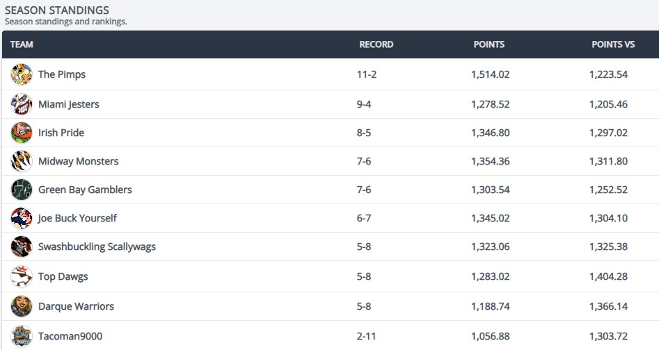 | Tacoman9000 | Due for a Win | The Perpetual Underdog Award | Finished the season 2-11-0. A team that will surely be drafting high and due for a major turnaround next season! |